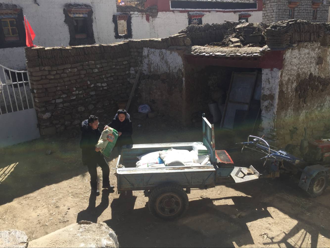 公司党委副书记傅早霞和学工办主任陈攀搬运生活物资赠送石达普尺家