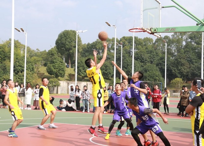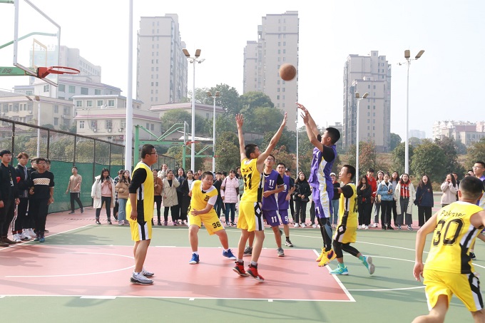 随着裁判员一声哨响,比赛正式开始。双方球员精神饱满,互不相让。一球!两球!三球……第一场比赛中,电商队便接连进球,暂时领先国贸队,球场上气氛顿时紧张起来!此时暂时落后的国贸球员越战越勇,摔了,不怕!抽筋了,再来!所有球员都拿出自己最好的水平,他们利落的投球姿势赢得观众一阵阵掌声! “最后五分钟!”这时国贸队成功反超电商队两分!以36:34的比分赢得新生篮球赛冠军!