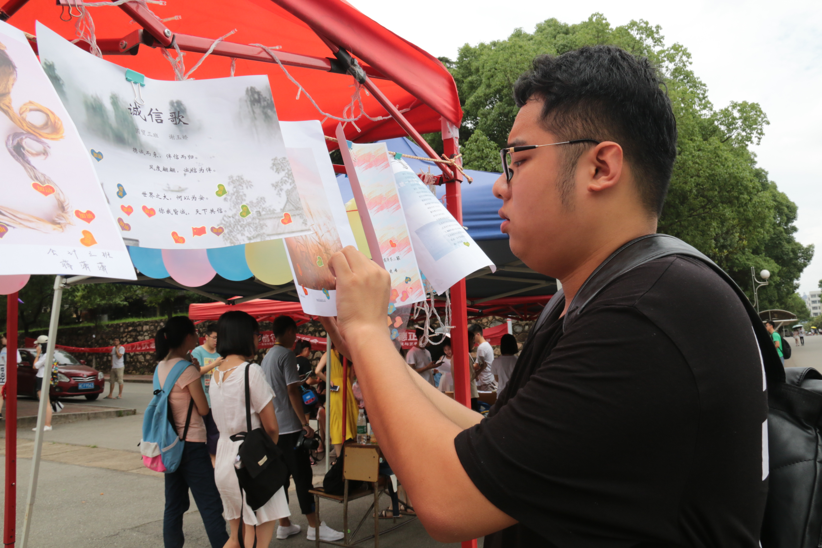 诗里咏诚,歌里颂信。6月9日,由球盟会和法学与公共管理公司联合承办的2017诚信诗歌创作大赛于八区食堂和美食广场摆点进行作品展示。本次活动首先通过了宣传收集了大量作品,最终甄选出30份优秀作品,再通过线上和线下的投票方式评选出一、二、三等奖共10名。公司党委副书记傅早霞以及全体辅导员也亲临现场参与其中并与工作人员合影留念。“这些作品都是来自同学们的原创,非常好。”傅书记对活动做出很高的评价,夸赞比赛中收集的作品都是原创非常有意义。老师们也纷纷为作品投票,表示出对活动的大力认可与支持。