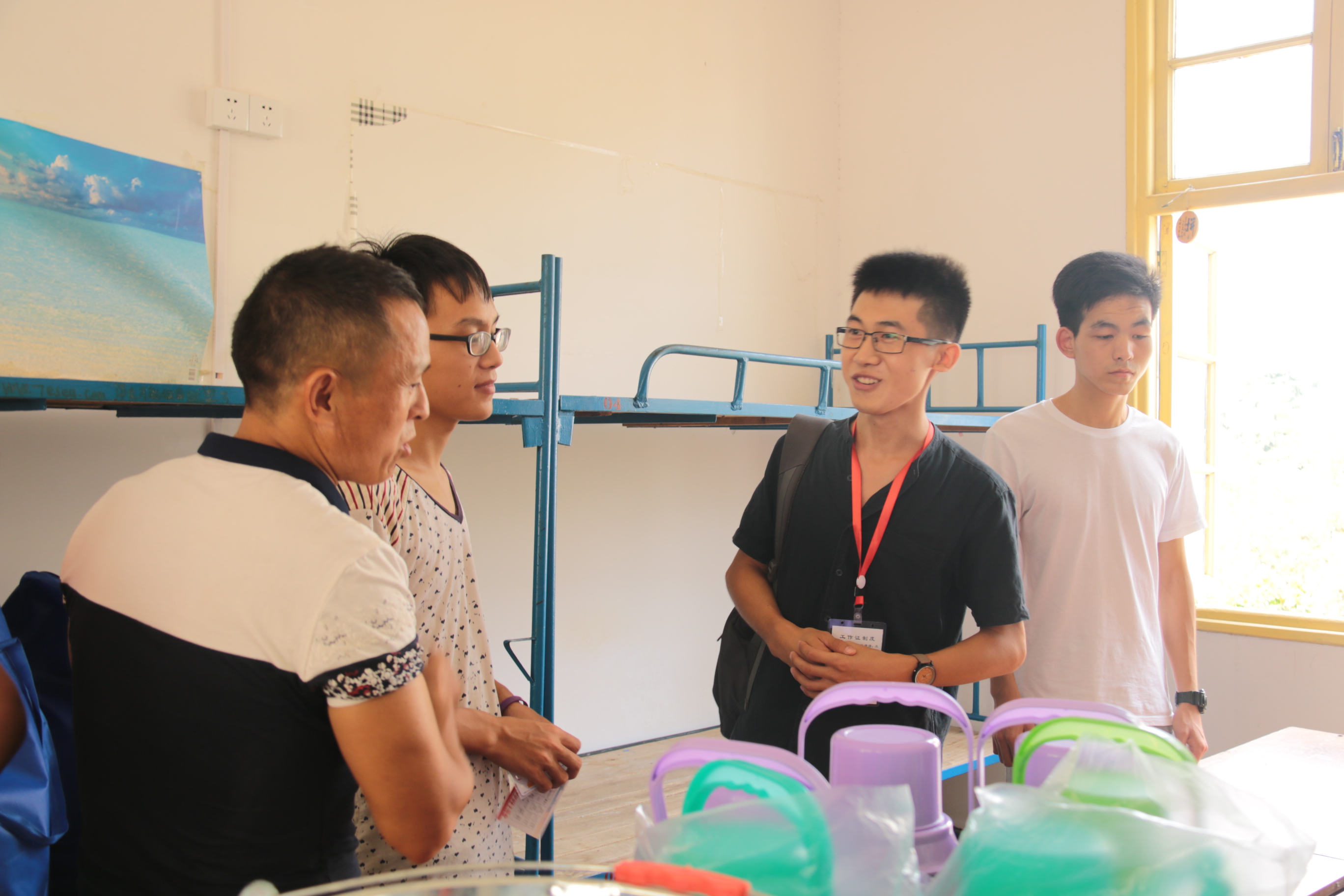 许多志愿者积极和新生联系,保证顺利接到新生把他们带到自己的宿舍。各班的新生助理班主任也在人群中穿梭,为的是找到新生分发钥匙并提醒一些注意事项。值班点的工作人员正积极为新生和家长解疑答惑,指引方向。宿舍区一片热闹氛围。