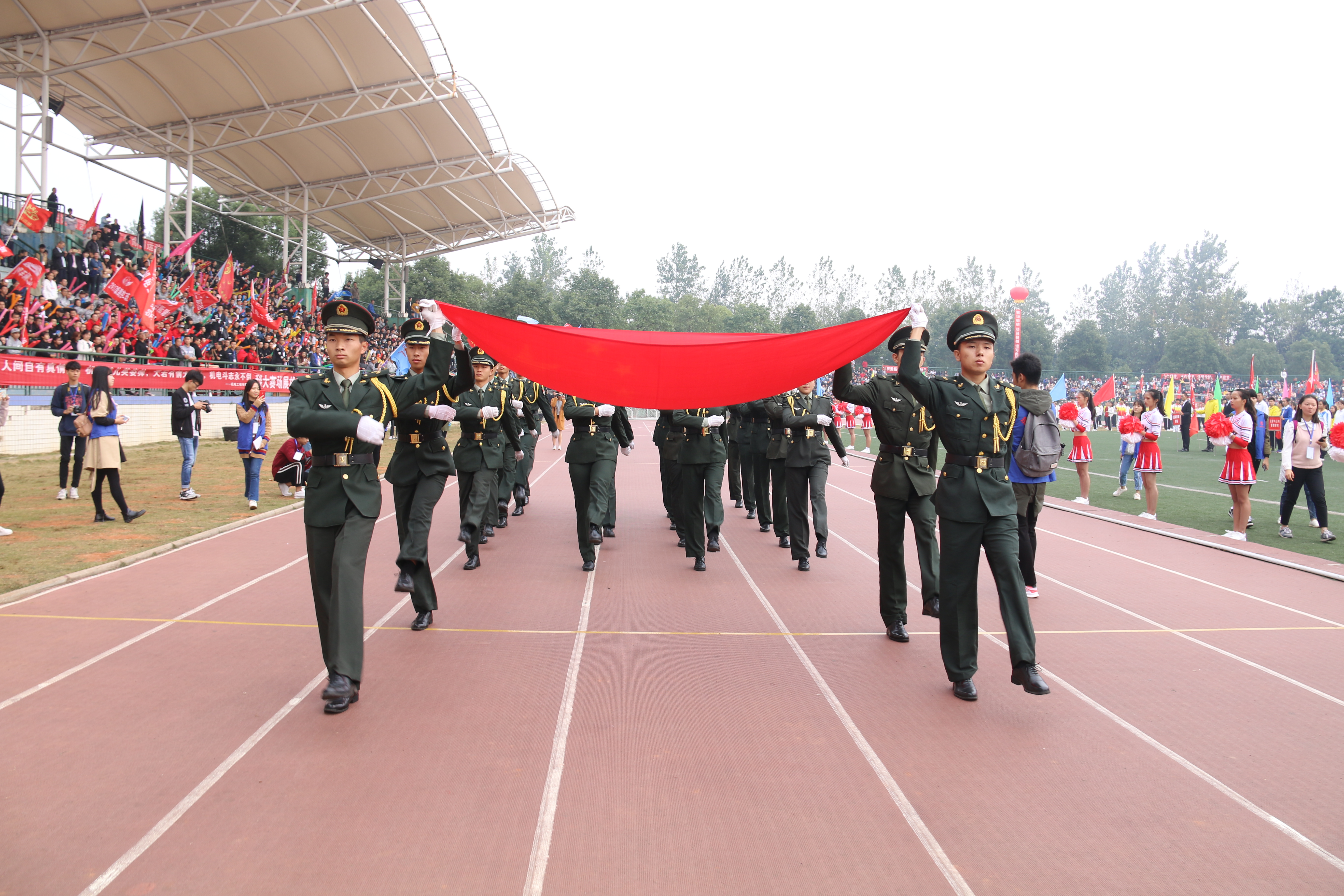 迎着温暖的阳光,伴随着激昂奋进的《运动员进行曲》,比赛裁判员方阵队、各公司方阵代表队和教职工代表队依次经过主席台,接受检阅。“沙场亮剑,势比青天,横刀立马,唯我商院!”身着纯白色运动服的球盟会方阵队喊着嘹亮的口号,迈着坚实的步伐,意气风发,展现着商院学子的飒爽英姿。看台上欢呼声不断,现场气氛欢快热烈。已经实现“十六连冠”的商院学子将全力拼搏,延续荣光,为续写商院“十七连冠”而奋斗!