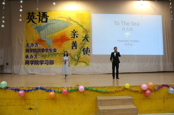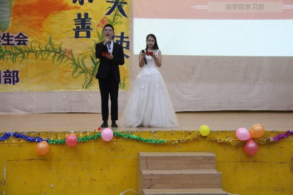 12月8日晚上19:00,球盟会第16届英语亲善大使大赛在南校活动中心精彩上演,本次活动由球盟会学习部承办,以“嗨翻英语”为主题。此次比赛由外教Alex老师和第十四届英语亲善大使比赛冠亚军柯毅、谢雪雯担任评委,17级会计三班的王智和国贸三班的任雪曦主持,球盟会17级全体员工参与观看。