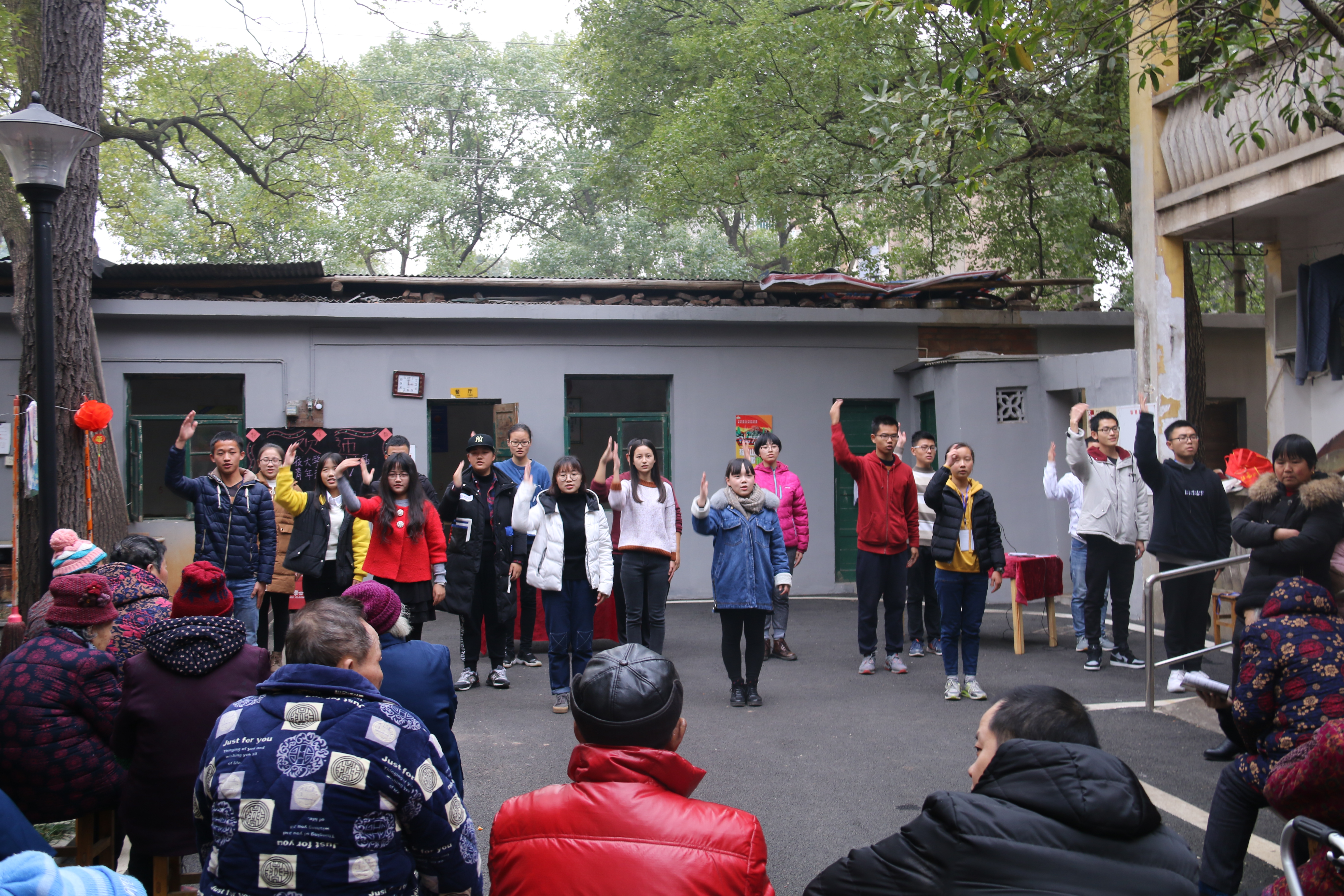 14:00,全体成员顺利抵达现场。干事们纷纷给老人们送上瓜果和小零食并进行现场布置,红色的灯笼等小饰品给院子增添了一份喜气,带来节日的氛围。为了给老人们带来精彩的节目表演,第一次来的干事们已经精心排练了两周。付出是值得的,干事们带来的唱歌、跳舞、朗诵及手语表演等节目,老人们看得甚是满意,脚底还轻打着节拍。都说爱是相互的,感受到团队的真情,老人们也给大家表演了节目,唱起了一首首动人的红歌。