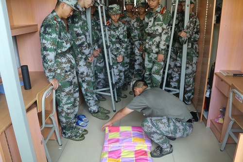 下午2:30,新生们的寝室里迎来了他们今天的“客人”——他们敬爱的教官。“教官好”,新生礼貌地向教官们打招呼,教官也亲切地回应他们,并告诉新生不用过于紧张。按照军训标准,教官对宿舍物品摆放、内务整理提出了要求并对各个细节方面进行了指点。内务整理中对于新生而言,最难的一点就是叠被子了。为了让新生学会叠“豆腐块”,教官让寝室长站在两侧,而自己一边亲身示范一边讲解。“一床优秀的被子要经过量、掏、擀、折、压等过程,每一步都是环环相扣的,必须要仔细认真。”教官在示范时说道。最后,在短短的几分钟里,教官手中开始乱糟糟的被子变得棱角分明,同学们都惊叹不已。教官向新生传授经验,说道:“三分叠七分修,你们在叠完被子后要对被子的角进行修整,如果被子很软立不起来的话可以在晚上压一压,或者垫几本书在被子里,这样可以让被子挺立一些。”教官们在最后还提醒新生整理内务时一定不要忽略角落和缝隙,要打扫得彻彻底底、干干净净。