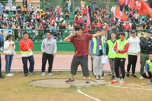 秋风萧瑟,看台上呐喊声起,上午9:40,甲组男子铅球赛事如火如荼地进行着。比赛中,只见吴春生托起铅球,将其稳稳地放在肩头锁骨,左手向前方斜伸,右腿向后退一步,用力投掷出去。随着一声暴喝—“呀”,铅球在空中划出一道完美的弧线,随后重击地面。而其他运动员实力也不容小觑,投掷方法大同小异,或稍将球举至耳垂微弯手臂,或托球高过头顶伸长手臂,比赛境况十分激烈。最终,吴春生成功进入决赛并取得第五名的优秀成绩。赛后,据吴春生叙述,他每天四十个俯卧撑、上下左右举球120次,虽训练苦,但其仍表示:“这是对我的历练,希望明年的我更加努力。”
